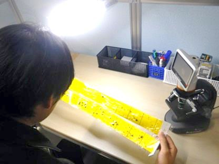 捕虫器等で捕獲された昆虫は、専門知識を持った技術者が同定検査を行い、虫の種類を特定します。