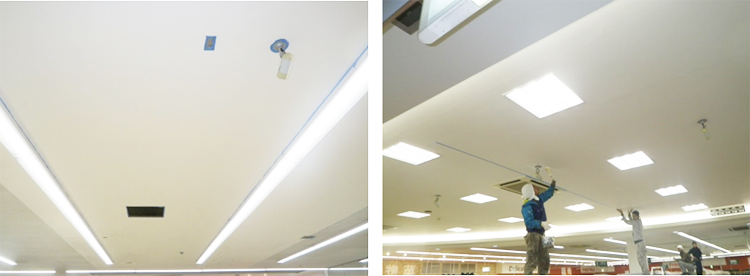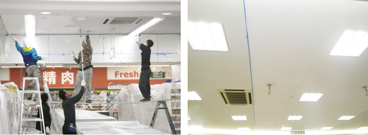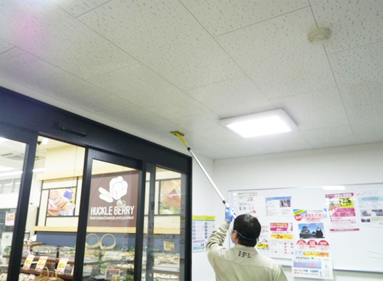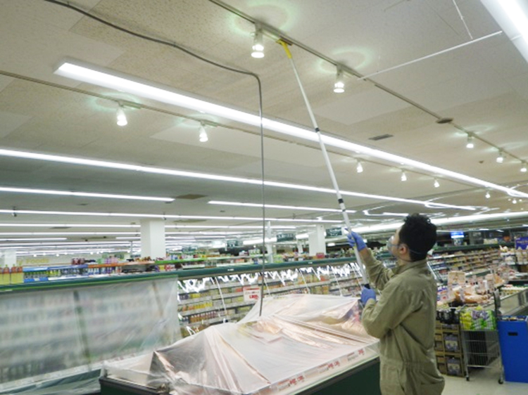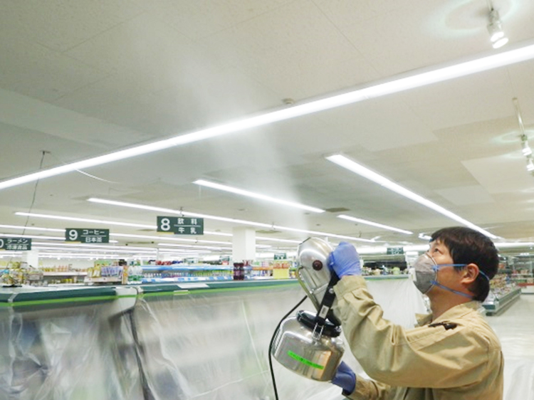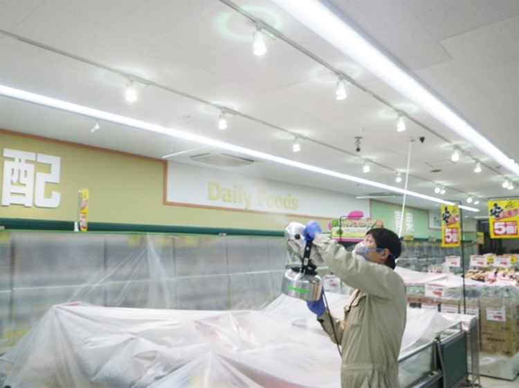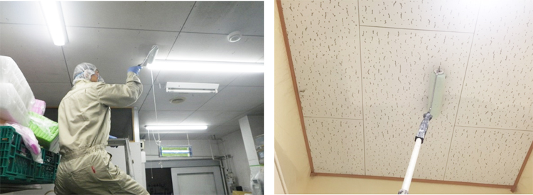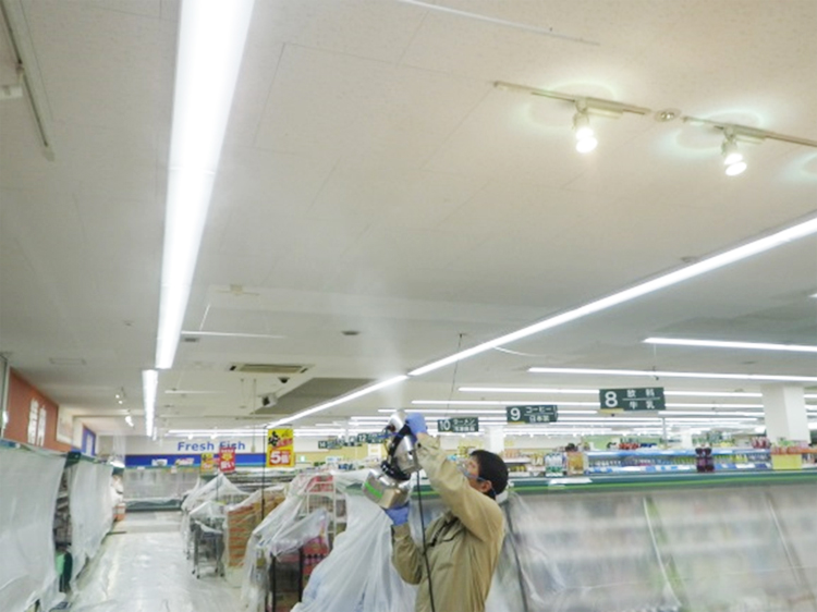 施工面に除菌剤を噴霧します。落下菌・菌の拡散を防ぎ、見た目にはわからない部分まで除菌処理を行います。